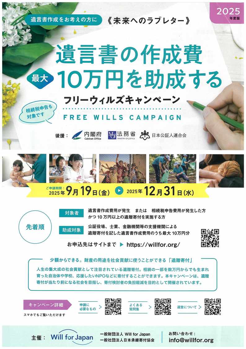 当事務所では、遺贈寄付の意義や遺言書作成の流れ、助成申請の手続きまでご案内します。キャンペーンの申請期間が今年中に限られております。ご検討中の方は早めにご相談ください。