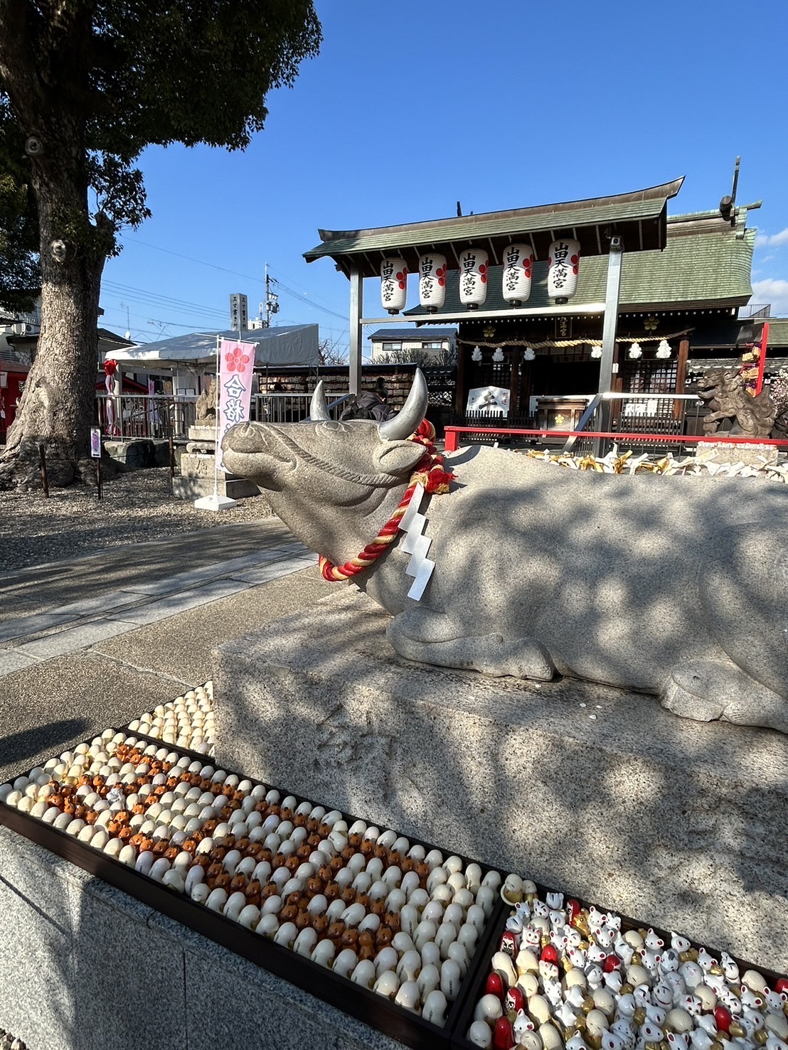 境内では牛を撫でて祈願しました。牛の周りに並ぶ小さな干支の小物が「2026」の数字になっていて、とても可愛らしかったです。